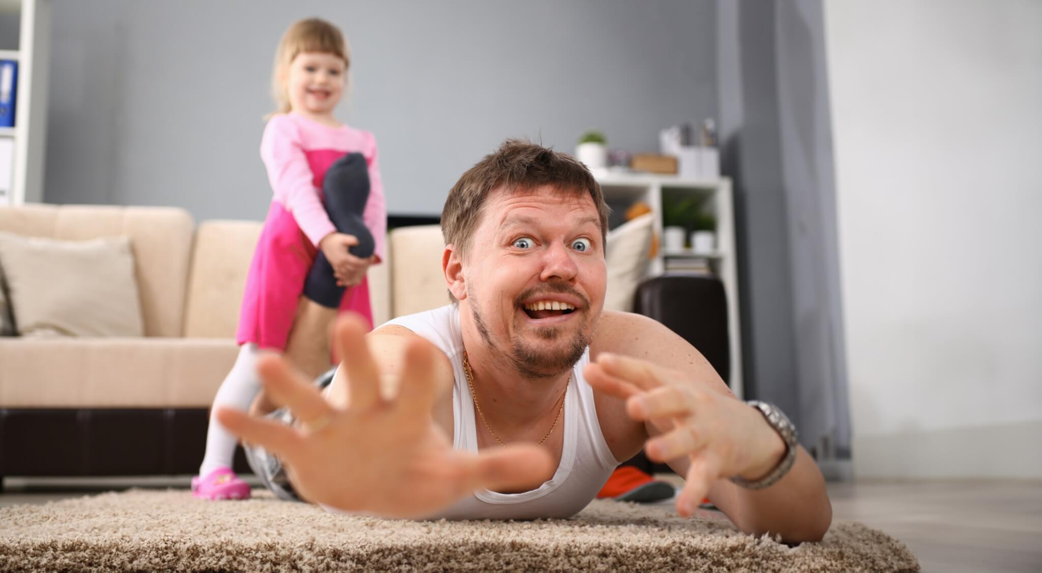 Acasă#ParentingNefiltrat: Hai să vorbim despre copii… și activitățile extrașcolareCute little girl hold her father leg as proof of winning battle game